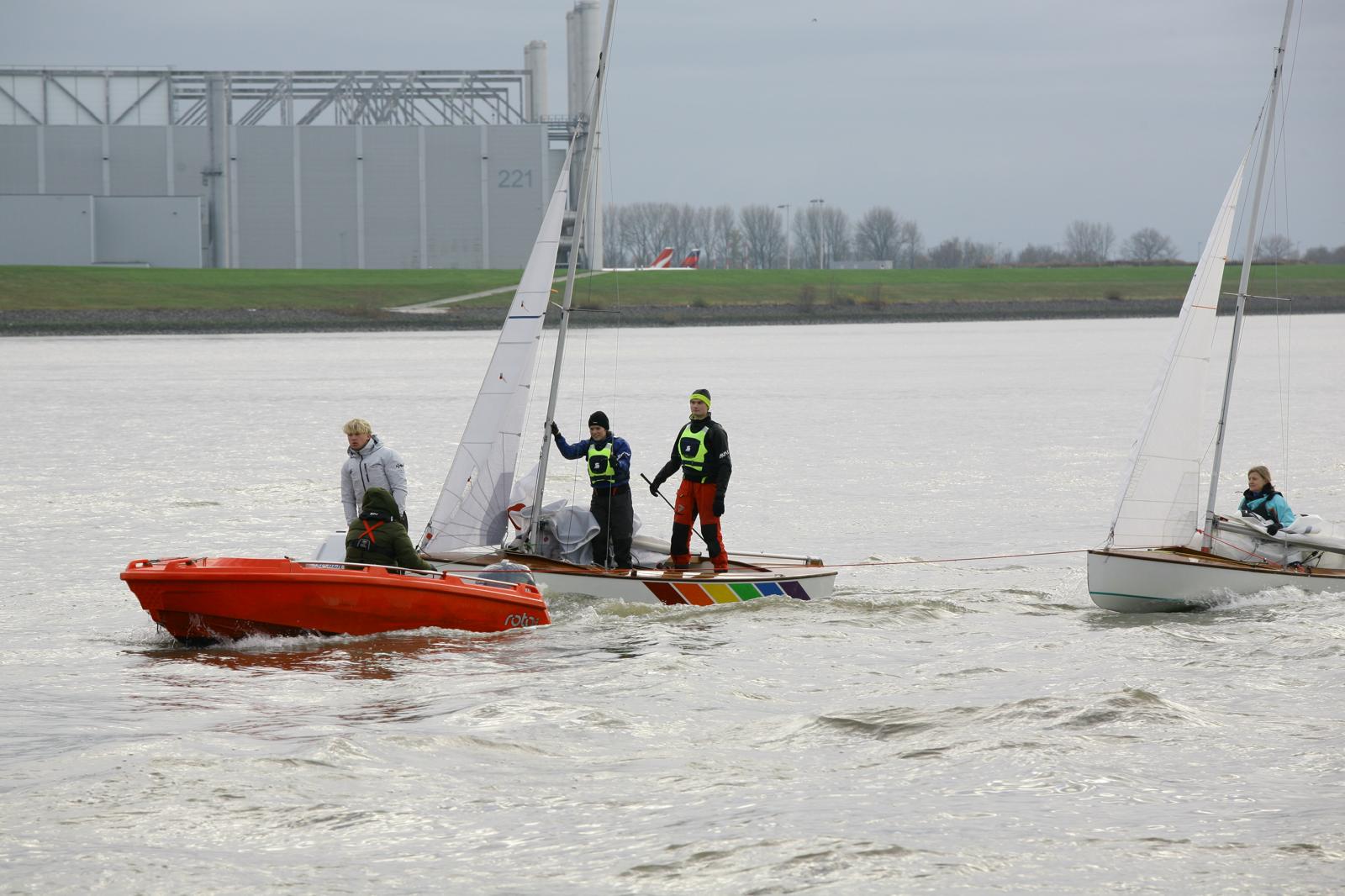 Der Sonntag war dann das komplette Gegenteil: keine Welle, kein Wind, aber immer noch bitterkalt… brrrr… und dazu diese gottverdammte Strömung. Wir mussten sogar zurück in den Hafen geschleppt werden, weil es bei dem wenigen Wind kein Boot gegen die Kraft der Elbströmung geschafft hätte. Diesen Tag möchte ich gerne den Revierkundigen widmen, denn bei uns lief leider gar nichts mehr, da wir mit der Strömung im Mühlenberger Loch so gar nicht zurecht kamen. Schön war der Tag trotzdem, und auf dem Rückweg in den Hafen hat uns sogar noch ein letzter Sonnenstrahl erwischt.